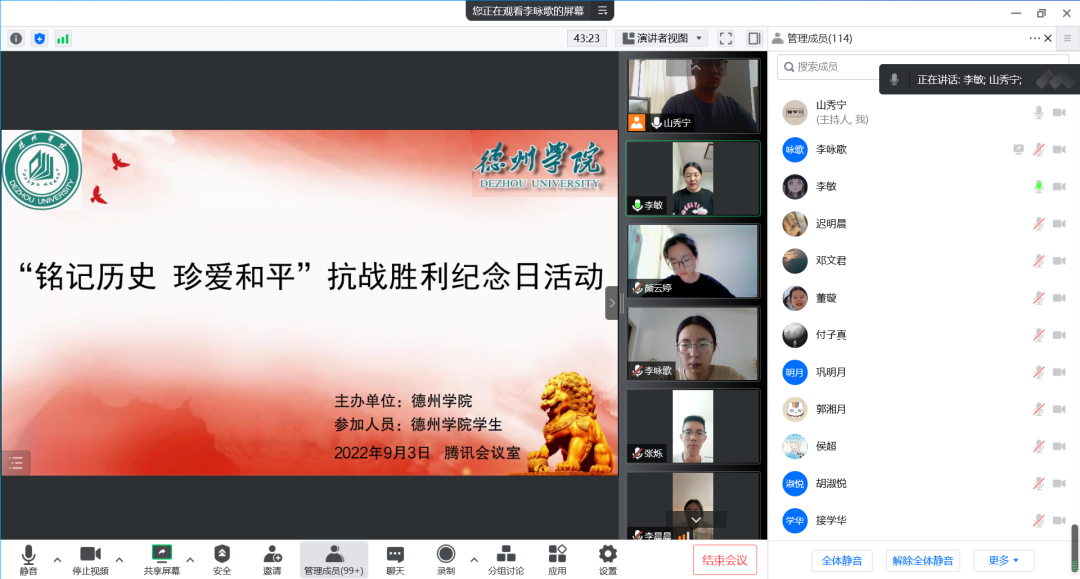 为纪念中国人民抗日战争暨世界反法西斯战争胜利77周年,弘扬革命文化,激发爱国情怀,引导青年员工继承和发扬党和人民在波澜壮阔的抗日战争中形成的伟大抗战精神,9月3日上午,文学与新闻传播公司在线上开展了以“铭记历史 珍爱和平”为主题的抗战胜利纪念日活动。