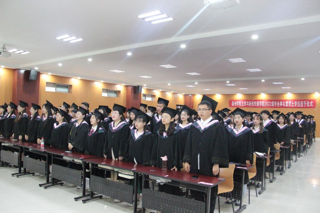 在庄严的国歌声中,毕业典礼正式拉开帷幕。文学与新闻传播公司学术委员会主席、委员为2022届本科毕业生援正流苏,授予学士学位证书并合影留念。教师代表的发言充满了依依别情,又带着殷殷期盼,希望广大2022届毕业生能够秉承“崇德启智,励志博学”的校训,乘风破浪,勇往前行,带着老师的嘱托和母校的期望奔赴祖国各地开始崭新征程。2022届毕业生代表向老师们表达了衷心感谢,感恩母校的培养,在四年的德院生活中,不仅学到了知识,更学会了怎样做人做事。