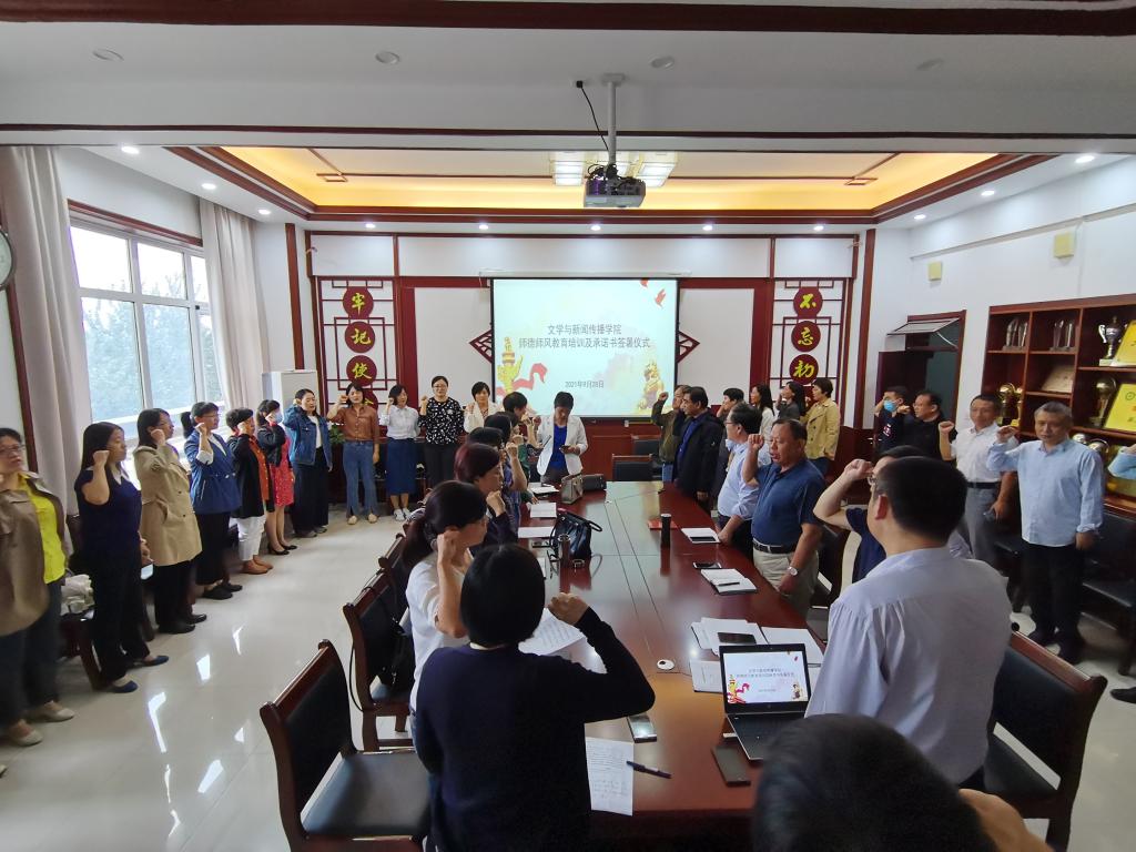 为进一步推进师德师风建设,增强教师对教育事业责任感和使命感,9月28日下午,文学与新闻传播公司开展师德师风教育培训及承诺书签署仪式,全体教师参加了本次学习教育活动。
