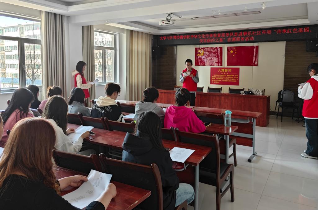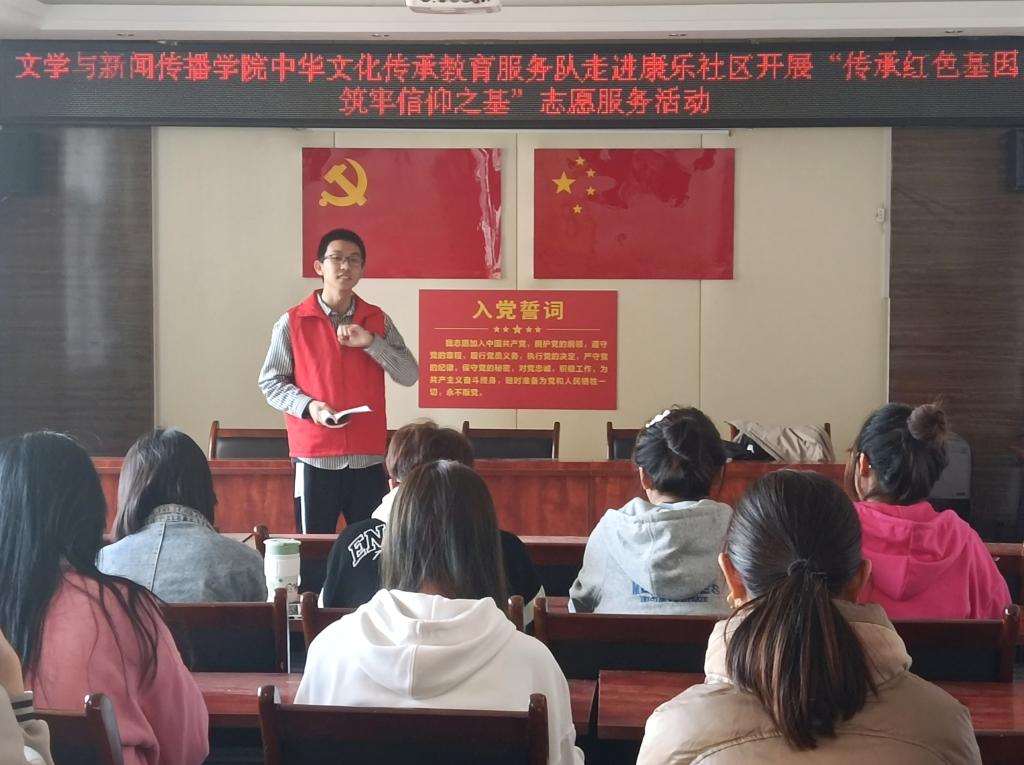 为了传承红色基因,弘扬革命精神,3月19日,文学与新闻传播公司中华文化传承教育服务队走进康乐社区开展“传承红色基因,筑牢信仰之基”志愿服务活动。