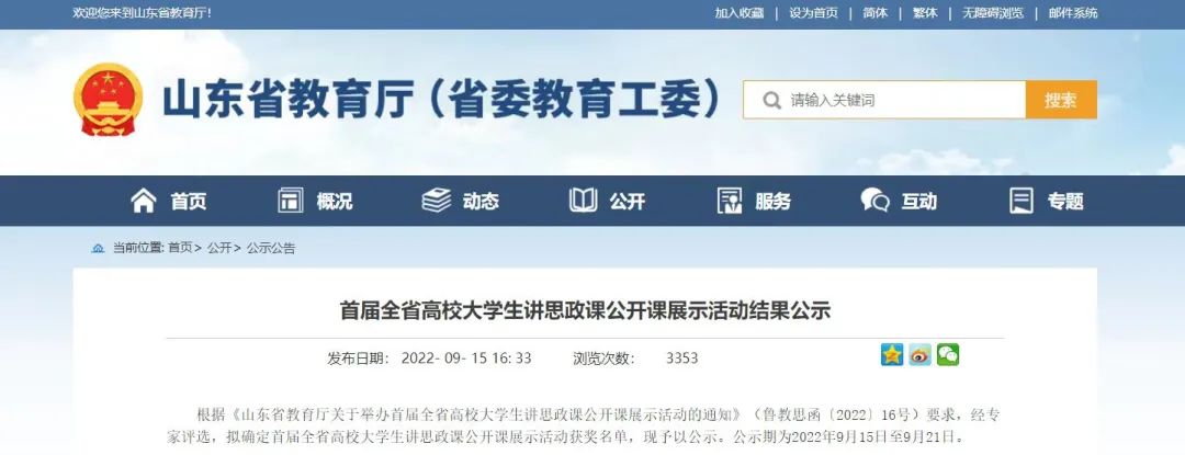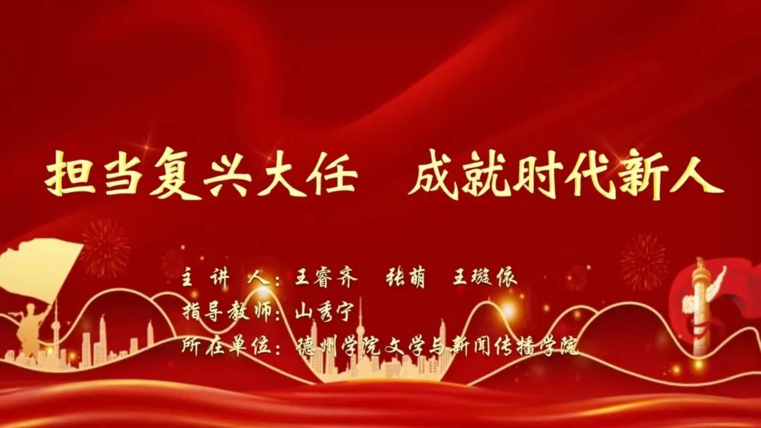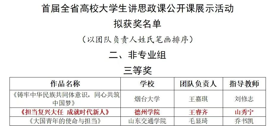 近日,经专家评选和公示,山东省教育厅公布了首届全省高校老员工讲思政课公开课展示活动获奖名单,其中,由山秀宁老师指导,王睿齐、张萌、王璇依同学主讲的作品《担当复兴大任,成就时代新人》荣获非专业组三等奖,并被推荐参加教育部高校思政课教学指导委员会主办的全国高校老员工讲思政课公开课展示活动。
