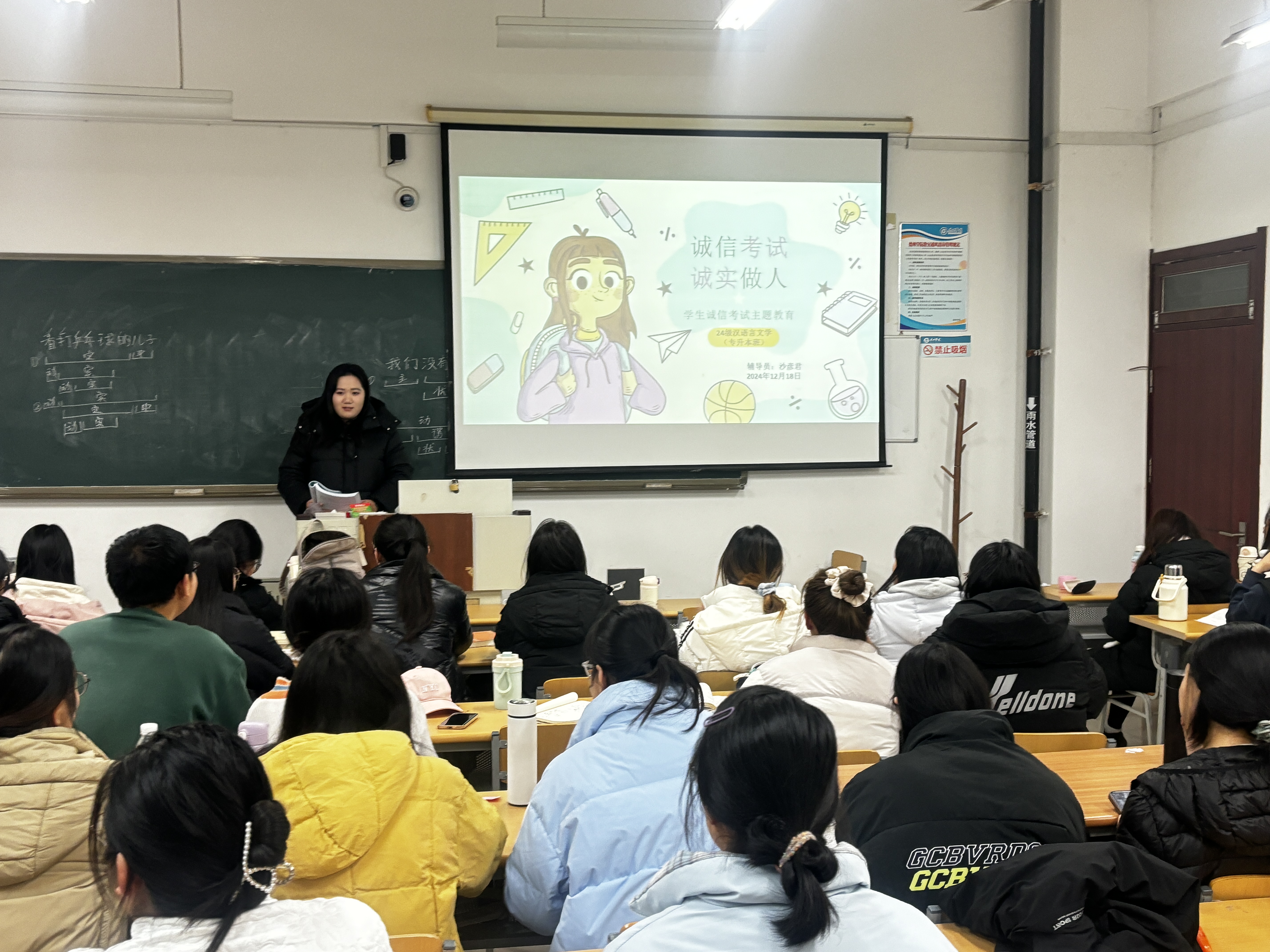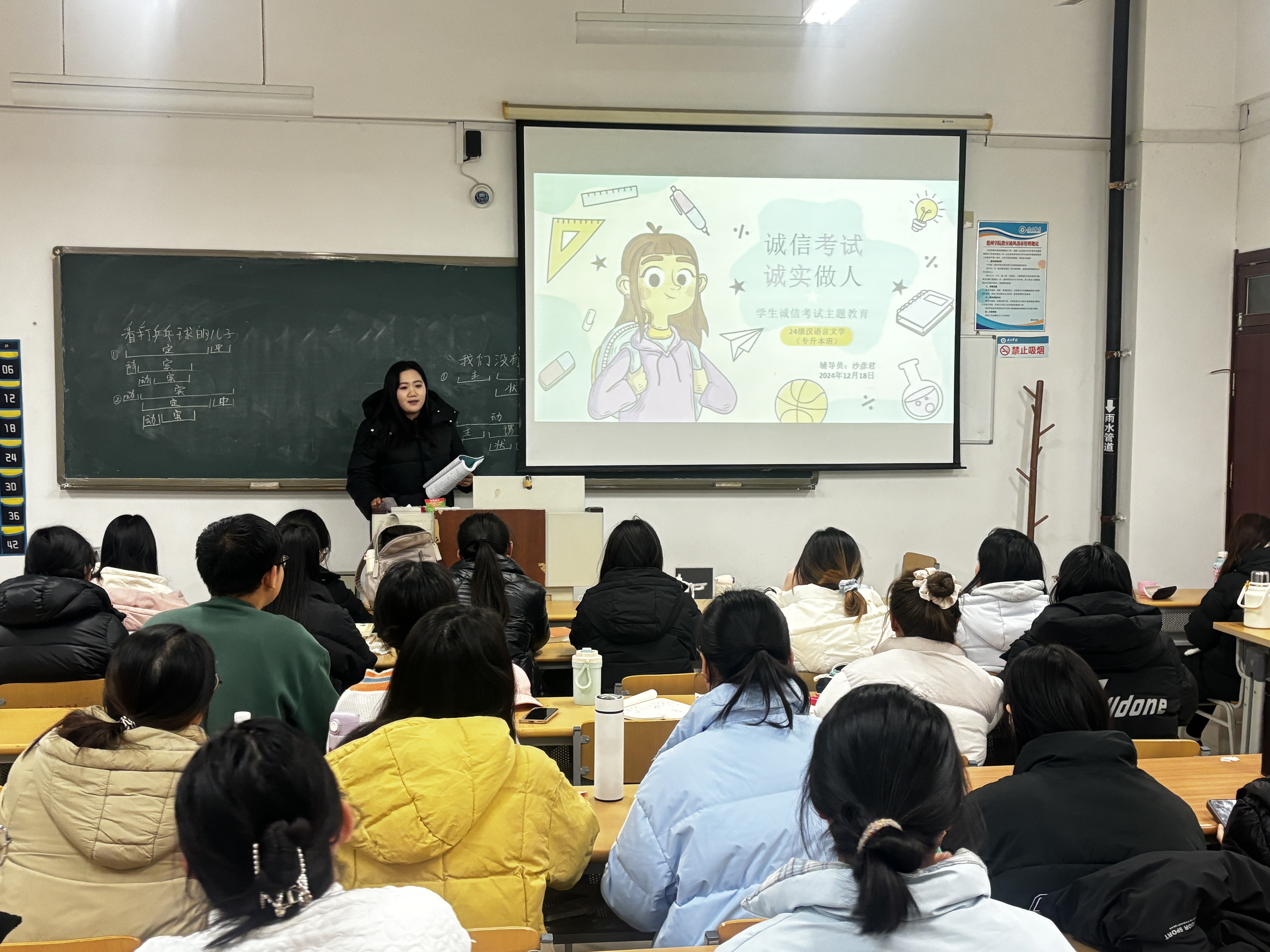 为积极响应公司加强考风考纪建设的号召,营造诚信考试的良好氛围,2024级汉语言文学专升本班于12月18日召开了诚信考试主题班会。本次班会由辅导员沙老师主持,全体同学共同参与,旨在强化同学们的诚信意识,引导大家树立正确的考试观念,以积极、端正的态度迎接即将到来的考试。