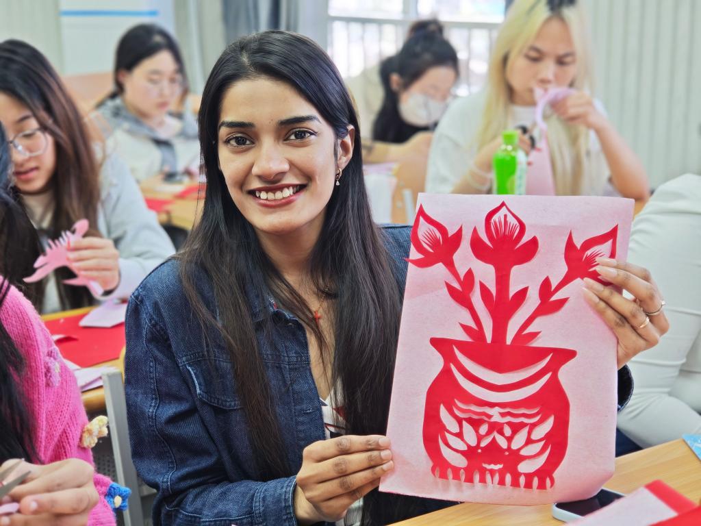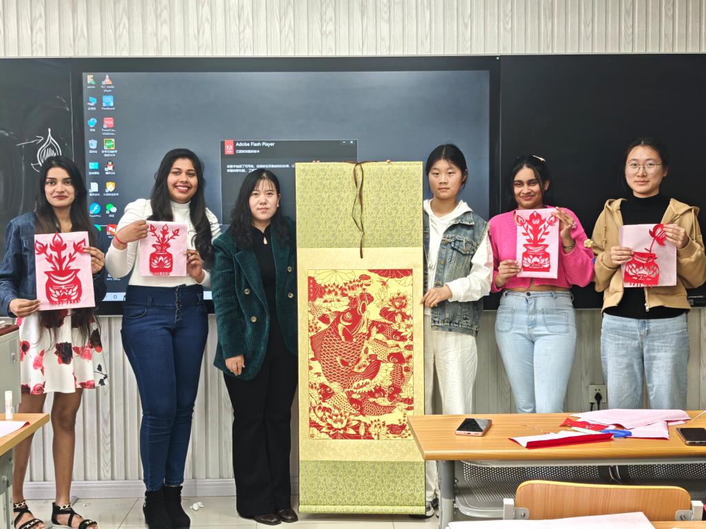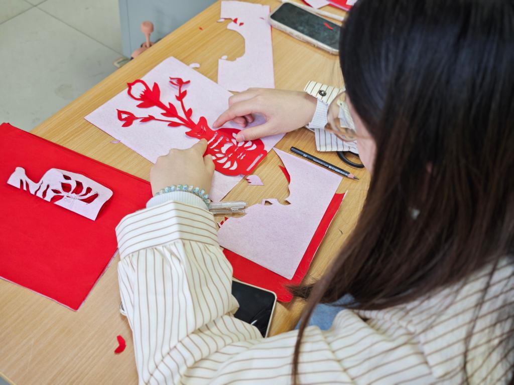 活动中,省级非遗项目朔之乡剪纸传承人石万照现场指导教学。从折纸、构图到下剪,在老师细致地讲解和指导下,同学们逐步掌握了剪纸的基本步骤与技巧。其中,外国职工们表现得尤为兴奋,她们被剪纸艺术的精妙深深吸引,纷纷拿起剪刀尝试创作,脸上洋溢着好奇与喜悦。随着剪刀的舞动,一幅幅精美的剪纸作品跃然纸上,其中既有寓意团圆美满的花瓶图案,也有灵动绽放的花朵造型。这些作品不仅生动展现了剪纸艺术的独特魅力,更寄托着大家对生活的美好祝愿。同学们互相交流着自己的作品,感叹剪纸艺术的博大精深,脸上洋溢着自豪与满足。