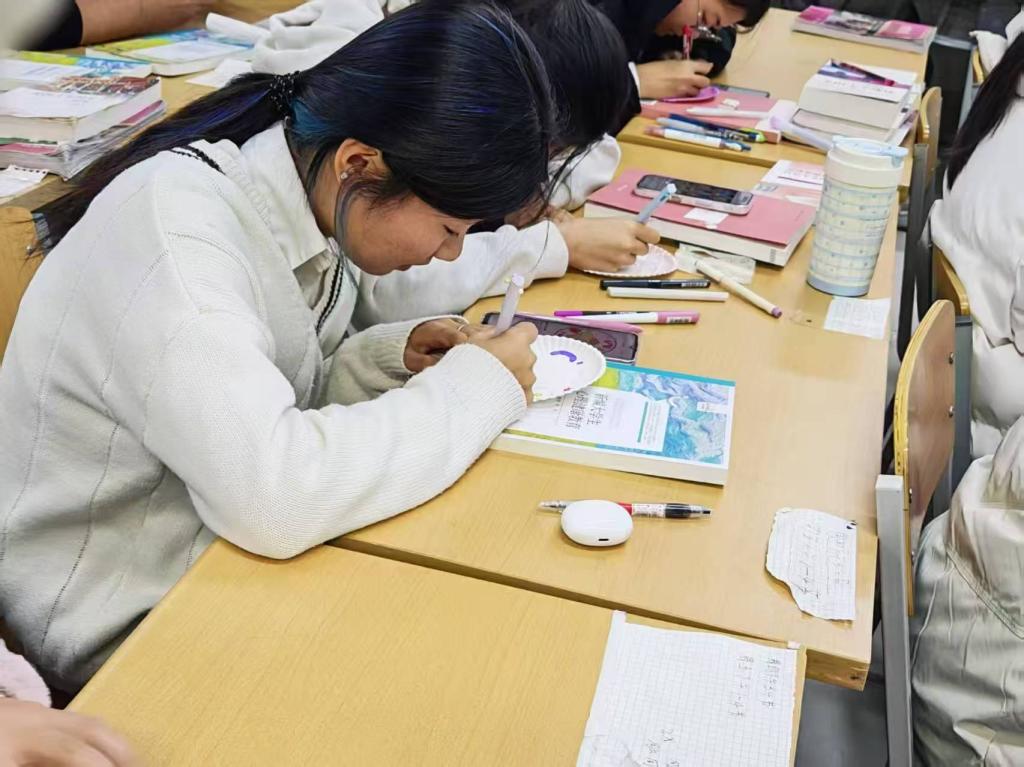 活动现场氛围轻松融洽。在曼陀罗圆盘画纸与彩笔之间,同学们渐渐沉浸于色彩的天地。大家围坐成组,执笔蘸彩,以不同线条与色块勾勒当下的心境。创作完成后,各小组依次展示作品,从线条疏密、色彩搭配等方面,互相解读画作中蕴含的情绪,分享调节情绪的方法。在真诚的交流中,不少同学意识到近期焦虑的来源,也学习到他人调节情绪的有效方法。通过绘画与倾诉,大家不仅掌握了一种易于操作的压力疏解方式,更在认识自我情绪的道路上迈进了一步,学会以更从容的姿态与内心世界相处。