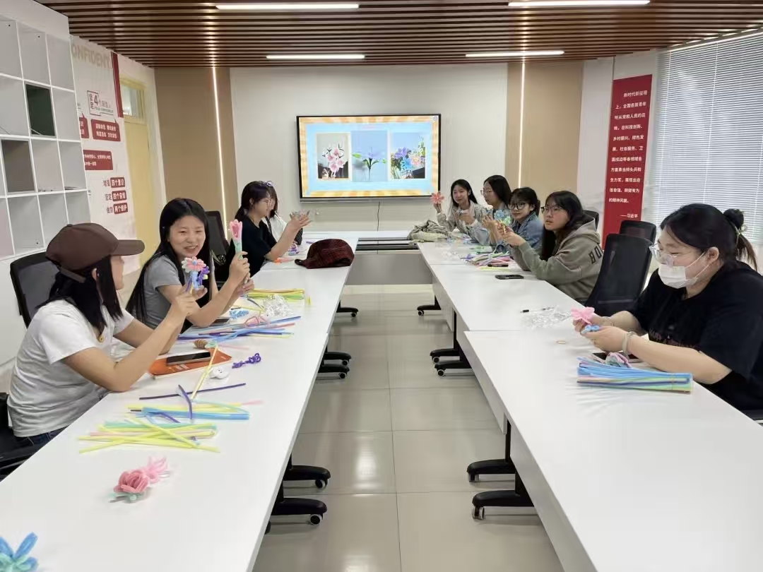 活动中,主持人通过鲜活的案例带领同学们系统学习了劳模精神中爱岗敬业、争创一流、艰苦奋斗、勇于创新、淡泊名利、甘于奉献的深刻内涵,引发了在场员工的强烈共鸣。理论学习结束后,手工制作环节随即展开。同学们迫不及待地拿起色彩缤纷的扭扭棒,专注投入到创作中。他们灵活地将扭扭棒弯折、缠绕、塑形,有人先将红色扭扭棒拧出螺旋状,精心雕琢成玫瑰花瓣的弧度;有人用黄色扭扭棒卷出向日葵的花盘,再用绿色扭扭棒制作出细长的茎叶。制作过程中,大家相互交流技巧,互相帮助调整造型,现场气氛热烈。完成花朵后,同学们又认真写下“以劳动书写荣光”“致敬平凡中的伟大”等真挚寄语,将对劳模的崇敬之情融入每一份手工作品中。