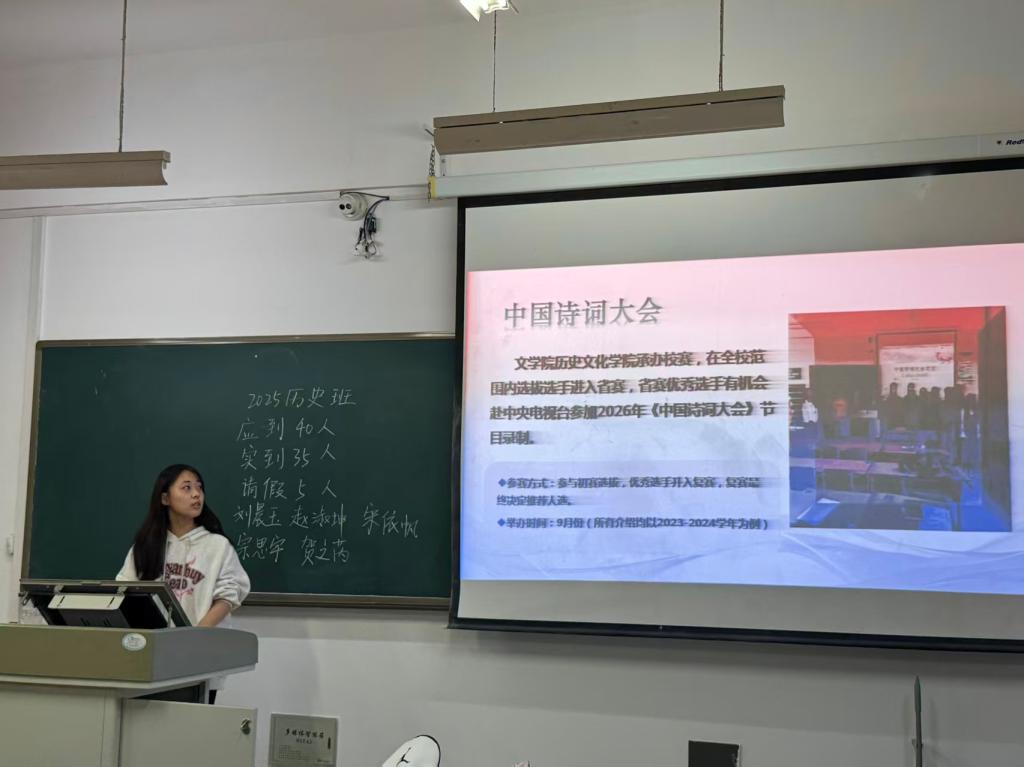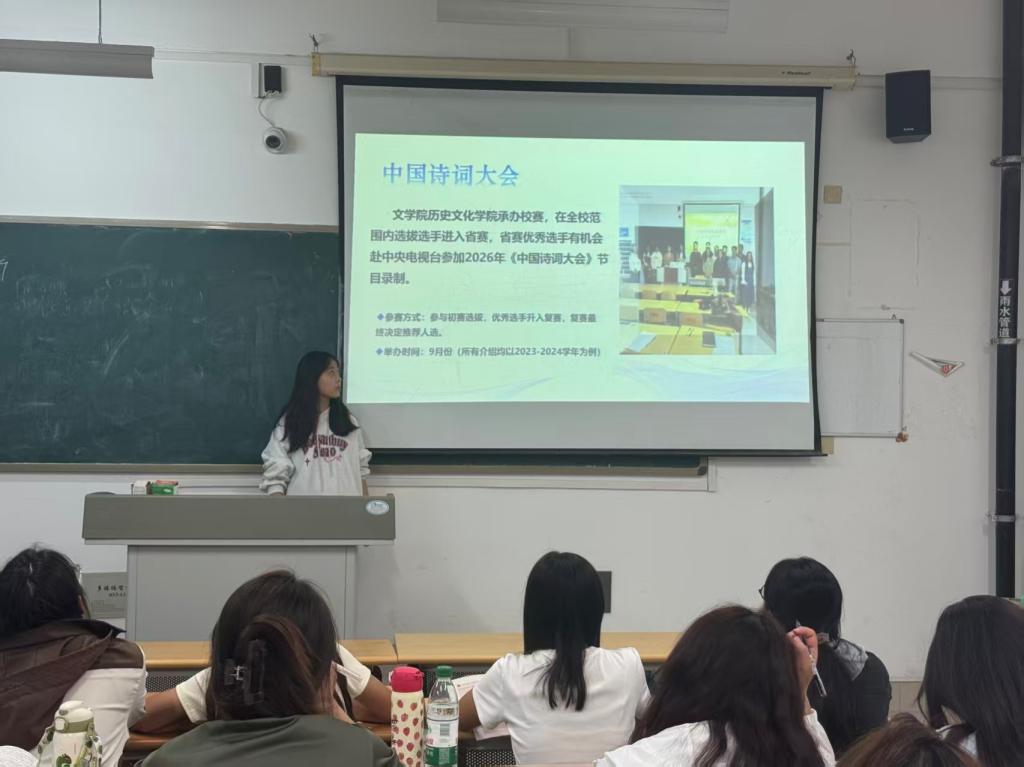 本次活动以“经典回顾+文化解读”的形式展开,通过系统介绍中国诗词大会的文化价值、报名流程、备赛技巧及公司历年参赛荣誉,为新生搭建起从聆听诗词到参与实践的文化桥梁。宣讲人在宣讲中鼓励新生积极拥抱诗词世界,强调“只要心怀热爱,人人皆可成为诗词舞台的主角”,为同学们带来一场知识性与感染力并重的文化盛宴。