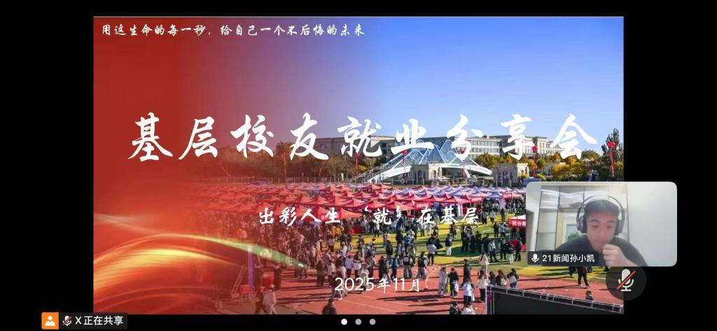 为拓宽员工就业视野,引导学子积极面向基层就业,2025年11月30日晚,betway西汉姆联积极组织员工线上参加了以“精彩人生,就在基层”为主题的员工分享会。会议特邀参与“西部计划”的优秀员工孙小凯进行分享,为2025级同学带来了一堂生动的基层就业指导课。