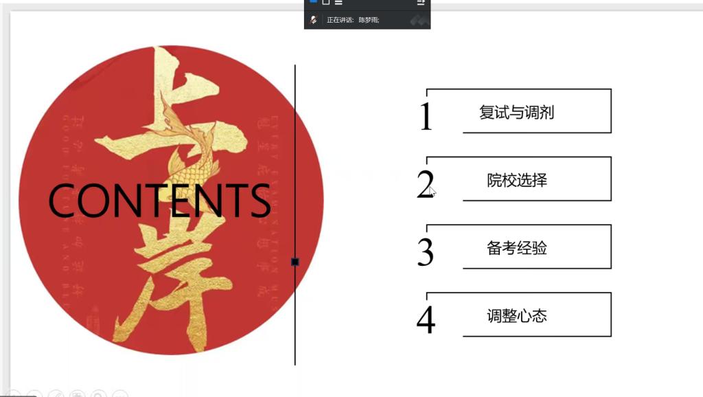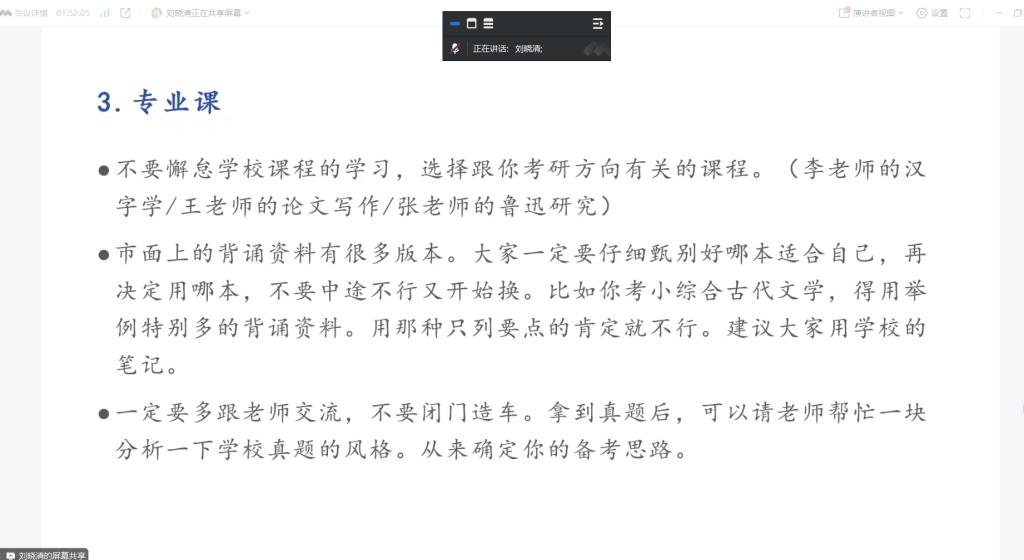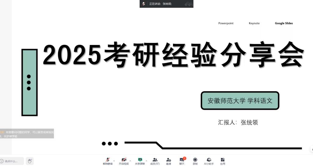 本次分享会邀请了4位2020届优秀毕业生进行经验分享,详细介绍了考研复试流程、英语口语、综合面试、复试调剂等方面的注意事项。考入西安外国语大学的赵梦蝶虽有事不能现场分享,但准备了逐字稿由主持人马超老师进行转述。她着重分享了考研择校和复试准备的方法,包括如何撰写复试简历、如何整理个人材料等,告诉大家考研过程中要“允许一切都发生”,学会及时调整心态,才能走得更稳。考入安徽师范大学的张统领结合自身经历,重点强调了复试模拟的重要性,建议在复试前进行不少于五次的模拟面试,以帮助自己适应高压环境,达到最好状态。考入牡丹江师范公司的陈梦雨提醒同学们要积极拓宽信息渠道,密切关注考研复试及调剂动态,就考研复试备考策略、心态调整等方面提出了具体建议。考入聊城大学的刘晓清详细介绍了考研择校的和复试专业课的方法,并建议现场同学不要懈怠公司课程的学习,复试专业课可以多跟老师们交流真题思路等。