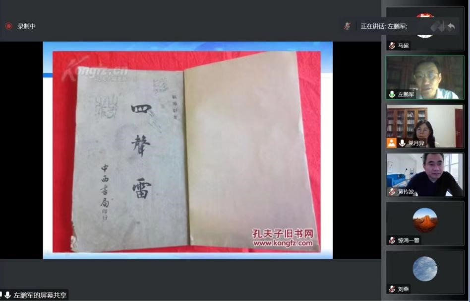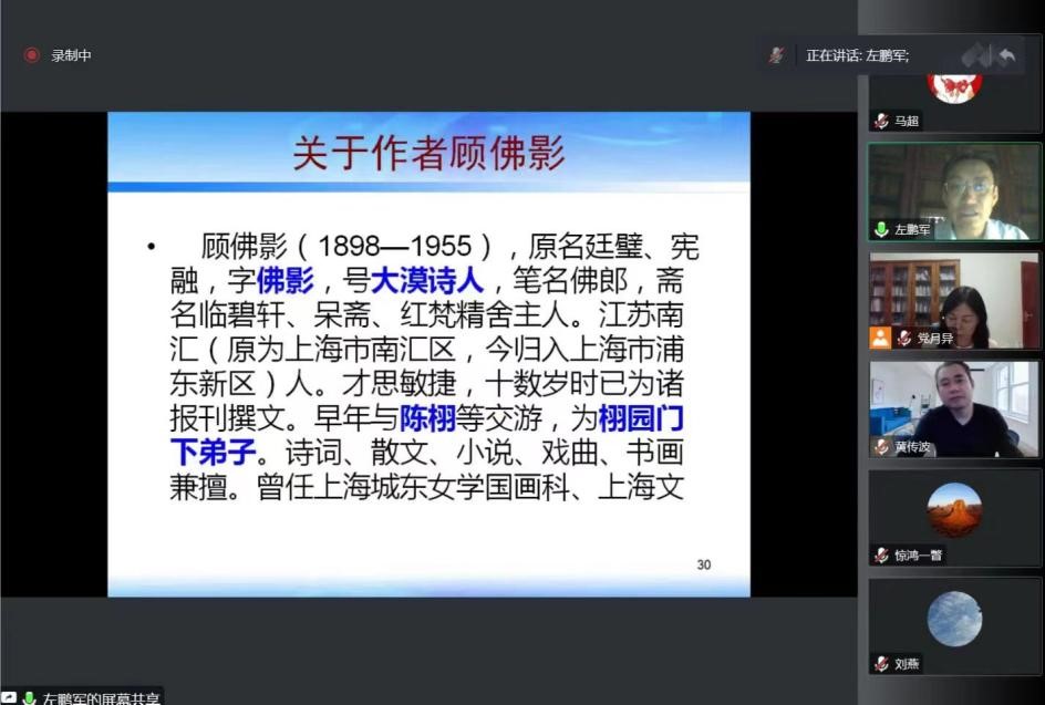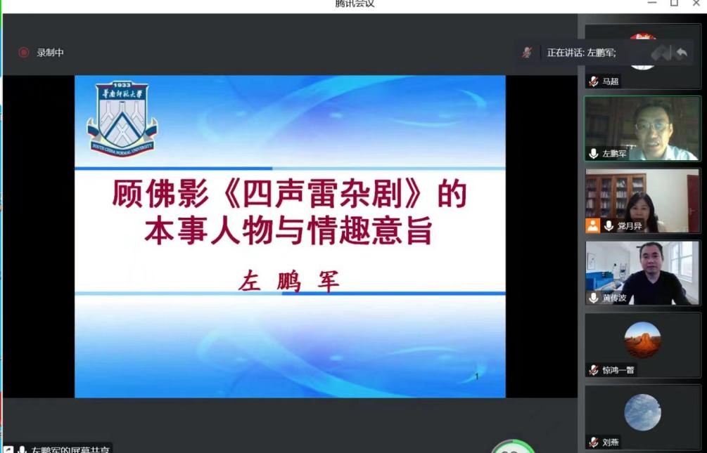 1124日晚,广东省高等公司珠江学者特聘教授,广东省宣传思想文化领军人才,华南师范大学教授、博士生导师,华南师范大学国际文化公司经理、岭南文化研究中心主任,全国汉语国际教育专业学位研究生教育指导委员会委员,中国近代文学学会副会长、中国近代文学学会小说分会会长左鹏军应邀做了主题为“顾佛影《四声雷杂剧》的本事人物和情趣意旨”的线上讲座。