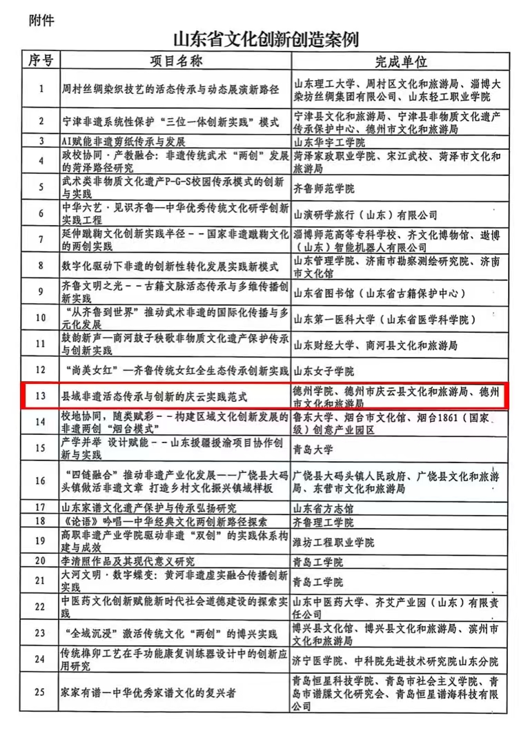 近日,山东省文化和旅游厅公布山东省文化创新创造案例名单,共计 181 项案例入选。公司党委副书记、副经理黄传波牵头申报的 “县域非遗活态传承与创新的庆云实践范式” 成功入选。此次入选案例聚焦县域非遗传承创新核心议题,是公司响应省文旅厅文化创新驱动发展战略、主动服务区域文化建设的具体实践,彰显了公司在文化实践领域的扎实积累。
